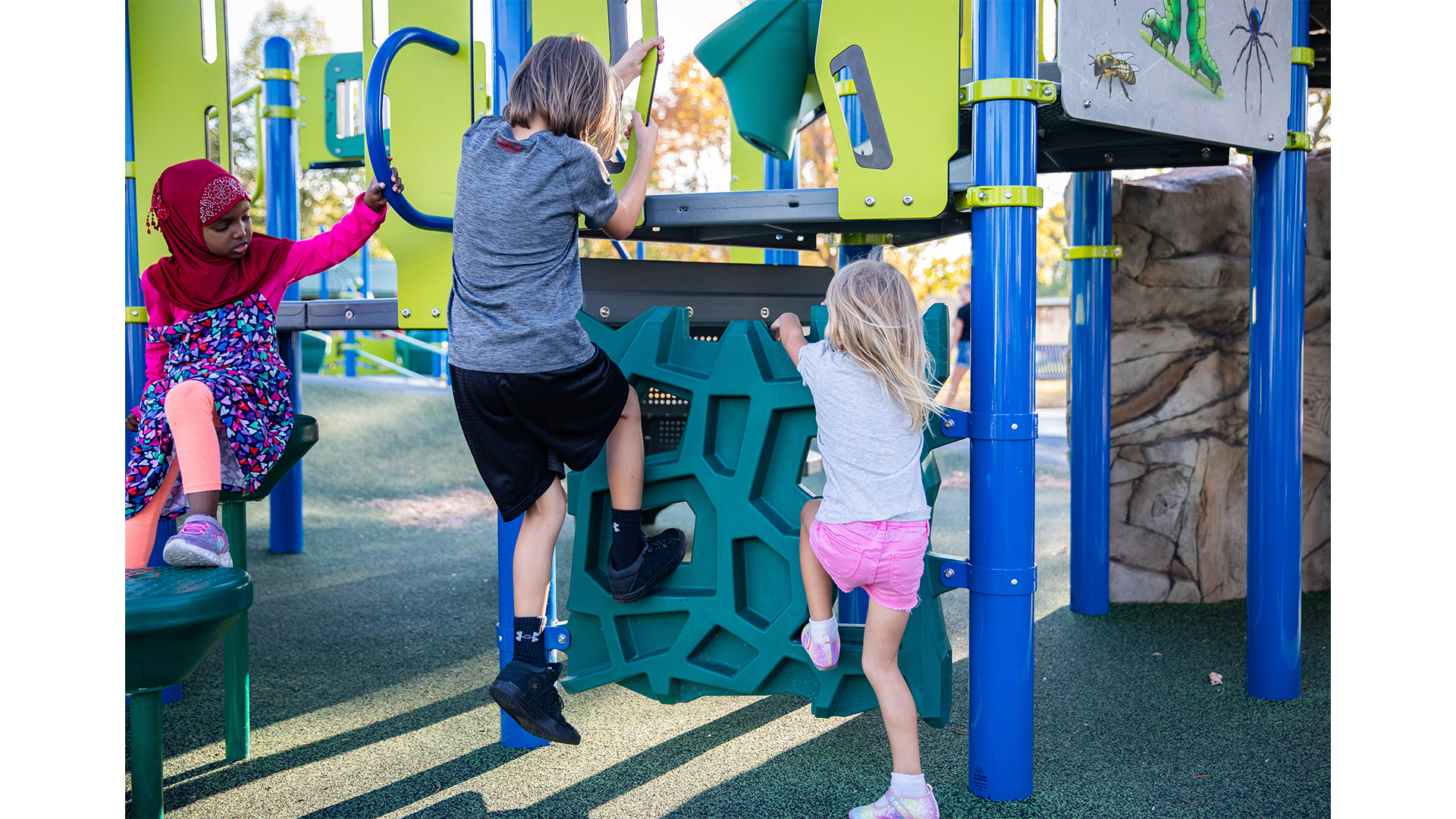 [video: top down view of the girl as she points to the GeoPlex panels. Scene switches to a ground view up at children as they climb on the ropes of a unique cargo net playground climber. Scene switches to a girl as she speaks to the camera and climbs the GeoPlex panels.]
