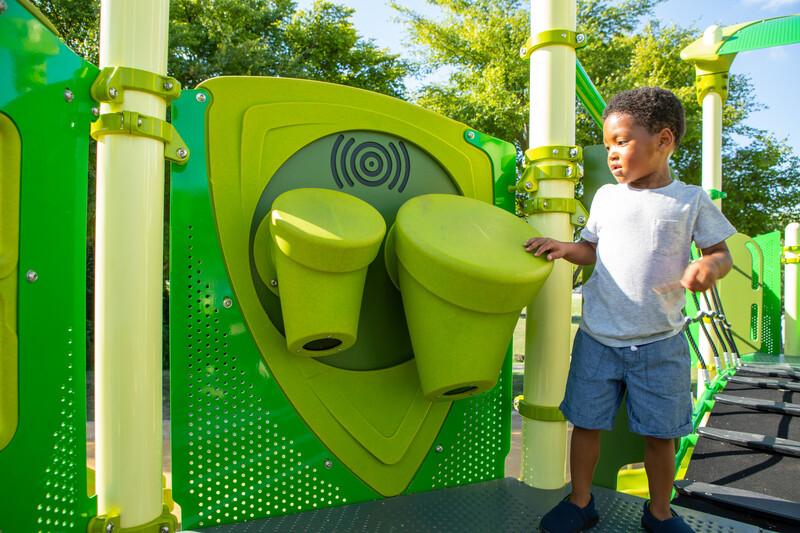 The Bongo Vibe Panel™ lets kids make their own beautiful music on the playground. Encourages the creation of new games, rhythms and songs. The Vibe® design is a stylish combination of perforated steel and playful rotomolded plastic that modernizes the traditional post-and-deck playsystem.Features