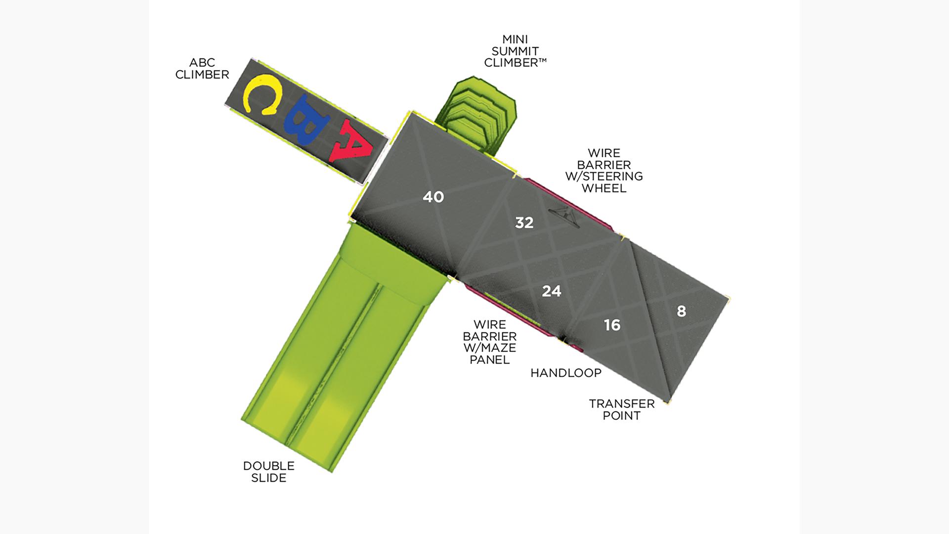 - Design 30 EZ includes the following components: ABC Climber, Double Slide, Handloop, Mini Summit Climber, Transfer Point, Wire Barrier with Maze Panel and Wire Barrier with Steering Wheel