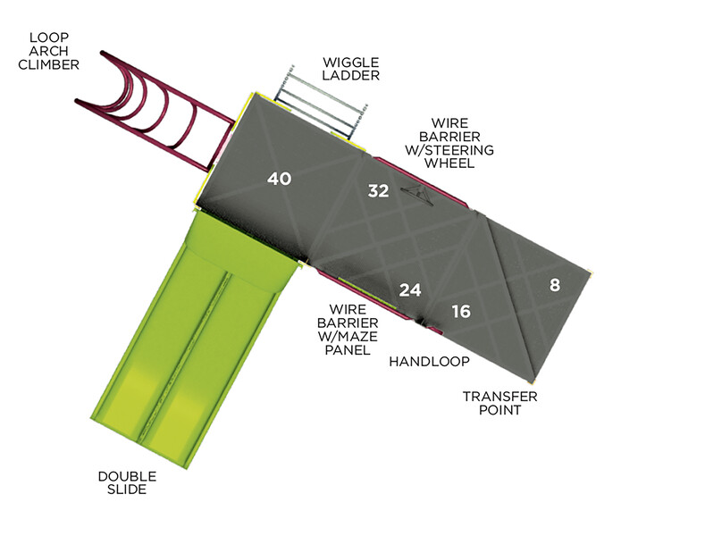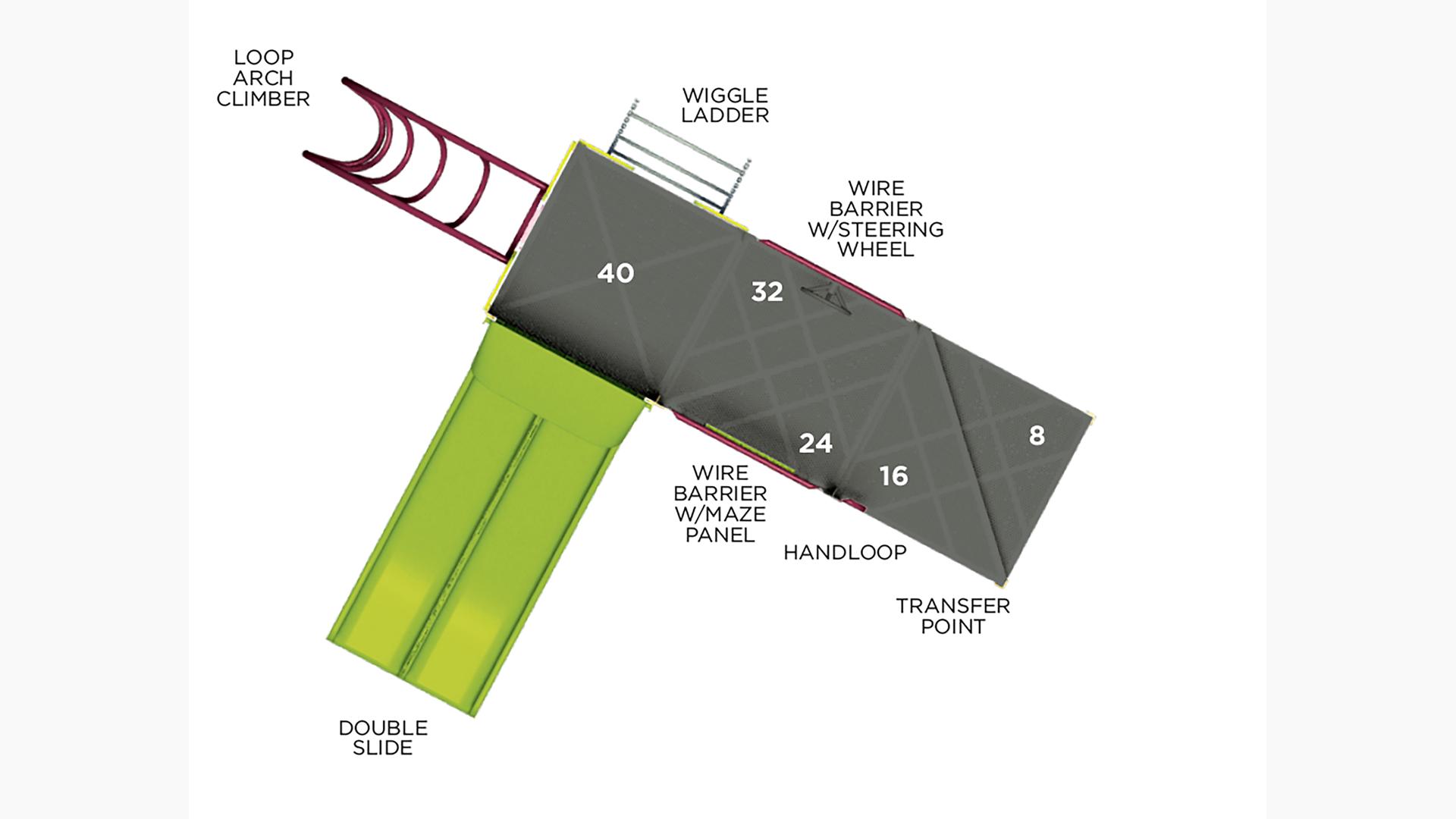 - Design 30 includes the following components: Double Slide, Handloop, Loop Arch Climber, Transfer Point, Wiggle Ladder, Wire Barrier with Maze Panel, and Wire Barrier with Steering Wheel