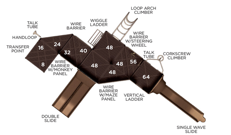 - Design 302 includes the following components: Corkscrew Climber, Double Slide, Handloop, Loop Arch Climber, Single Wave Slide, Talk Tube (2), Transfer Point, Vertical Ladder, Wiggle Ladder, Wire Barrier, Wire Barrier with Maze Panel, Wire Barrier with Monkey Panel and Wire Barrier with Steering Wheel