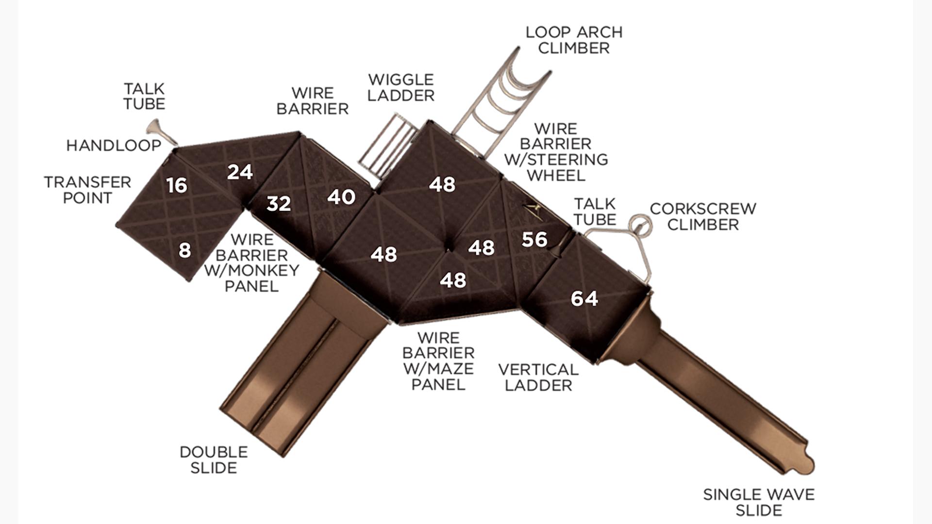 - Design 302 includes the following components: Corkscrew Climber, Double Slide, Handloop, Loop Arch Climber, Single Wave Slide, Talk Tube (2), Transfer Point, Vertical Ladder, Wiggle Ladder, Wire Barrier, Wire Barrier with Maze Panel, Wire Barrier with Monkey Panel and Wire Barrier with Steering Wheel