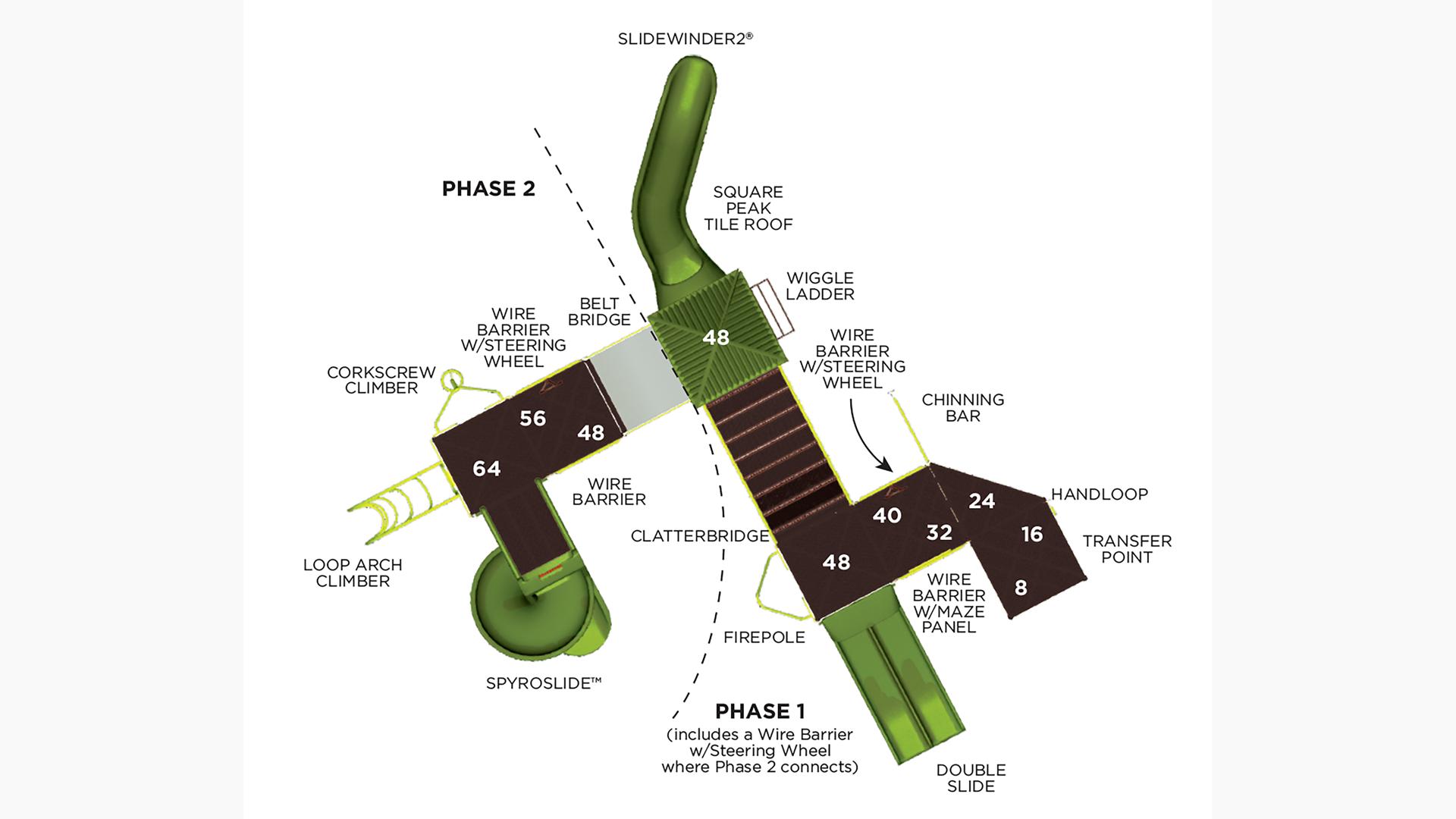 - Design 304 Phases 1 & 2 Complete includes the following components: Belt Bridge, Chinning Bar, Clatterbridge, Corkscrew Climber, Double Slide, Firepole, Handloop, Loop Arch Climber, SlideWinder2, SpyroSlide™, Square Peak Tile Roof, Transfer Point, Wiggle Ladder, Wire Barrier, Wire Barrier with Maze Panel and Wire Barrier with Steering Wheel (2)