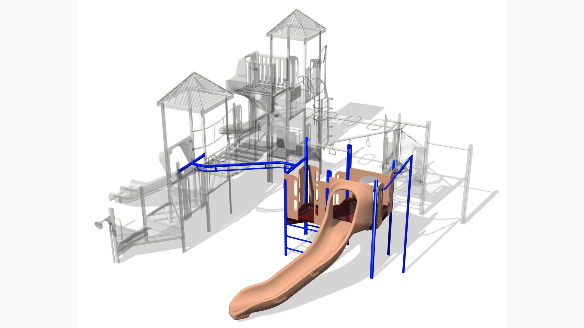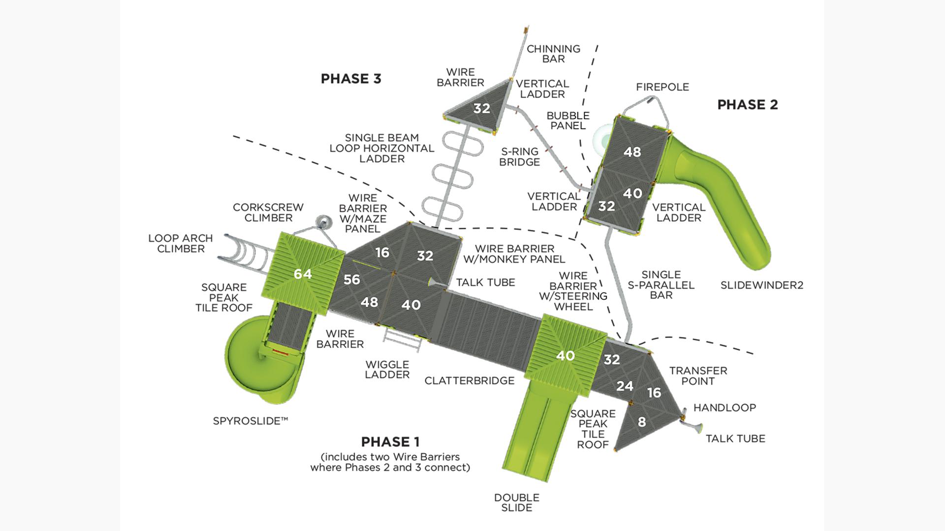 Add this climber, slide, overhead event and play panel to PlaySense® Design 307 Phase 1 when your customer's budget permits. A Phase 3 option is available as well. Phase 1 must be purchased prior to Phase 2. A Wire Barrier is removed when Phase 2 is added.