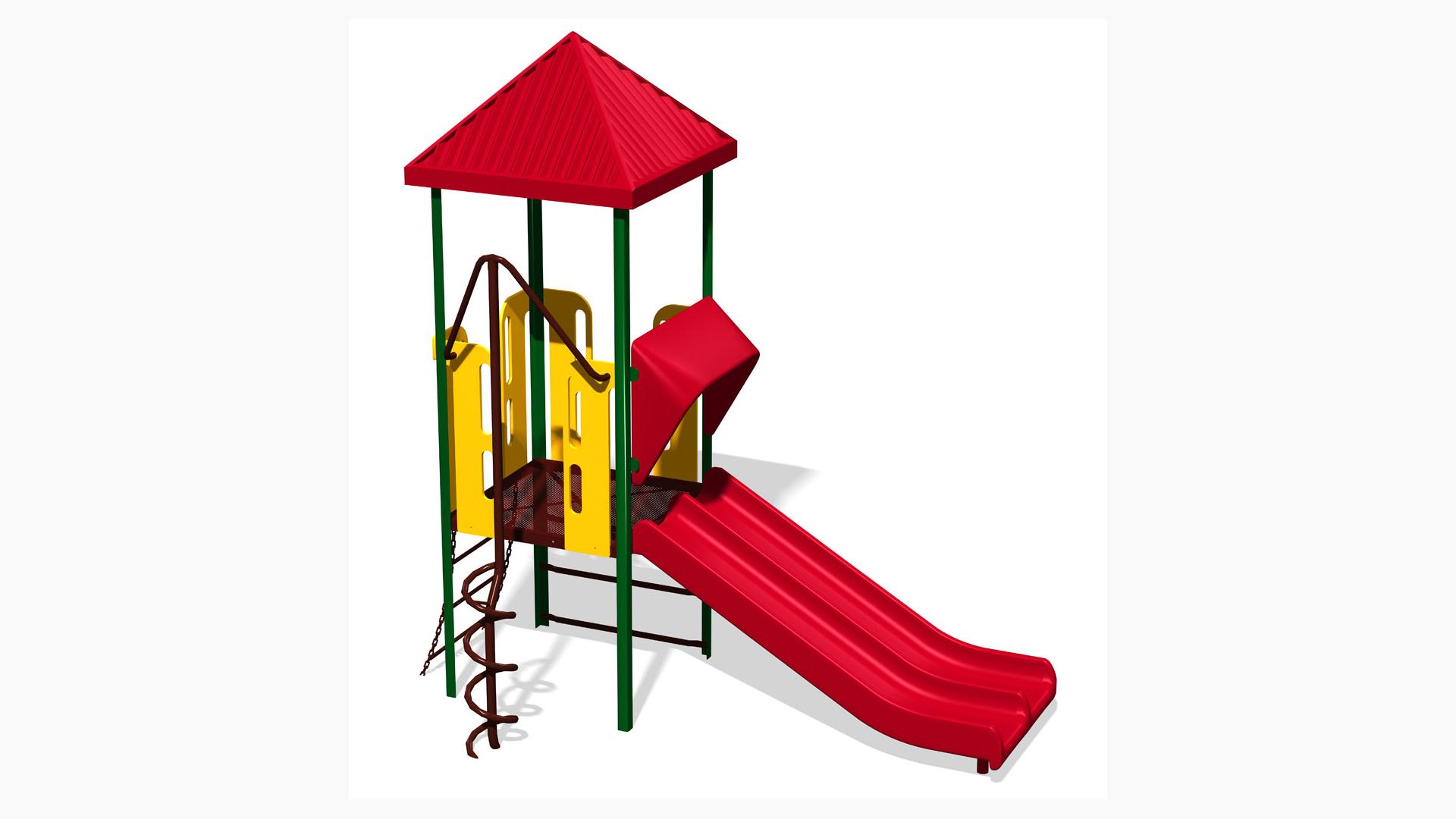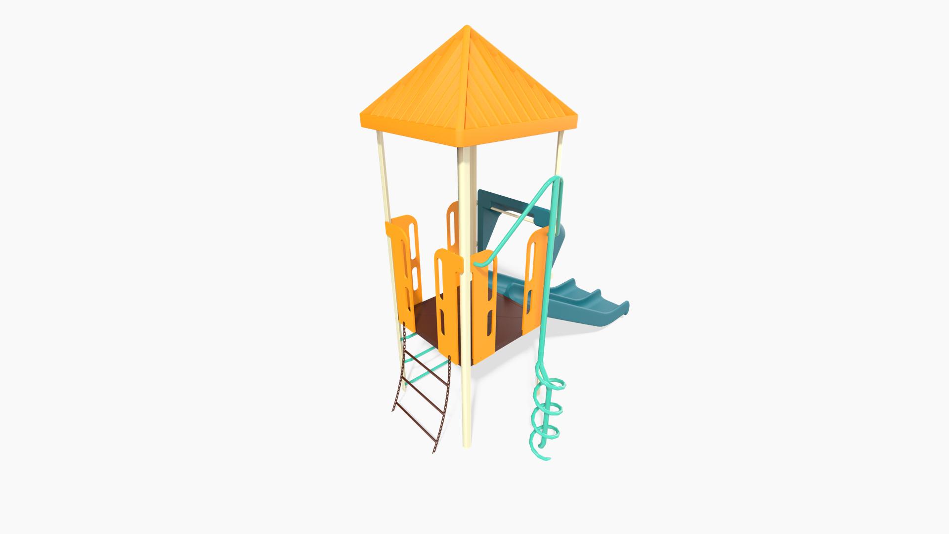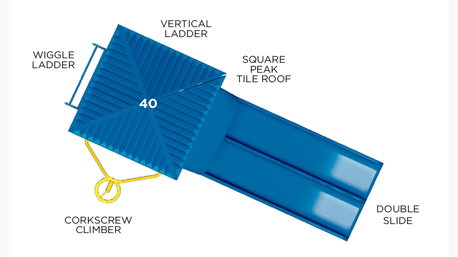 • Design 32 includes the following components:  Corkscrew Climber, Double Slide, Square Peak Tile Roof, Vertical Ladder and Wiggle Ladder.
