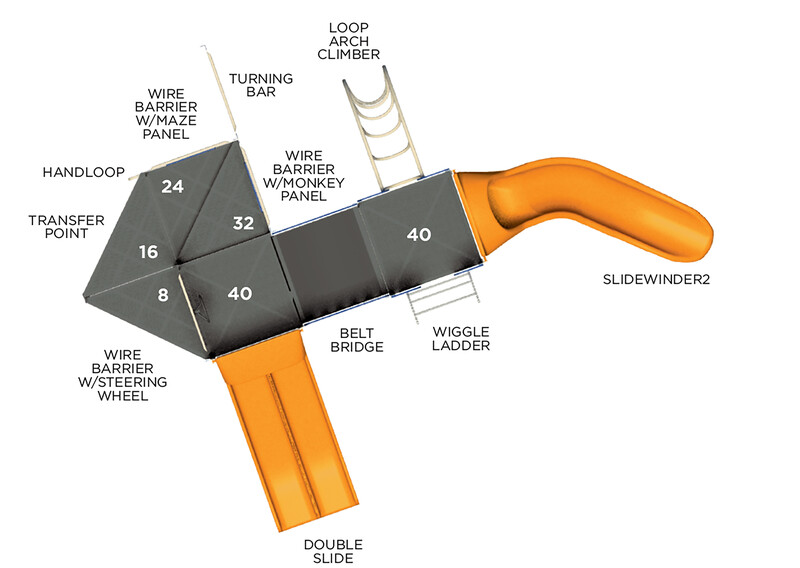 - Design 33 includes the following components: Belt Bridge, Double Slide, Handloop, Loop Arch Climber, SlideWinder2, Transfer Point, Turning Bar, Wiggle Ladder, Wire Barrier with Maze Panel, Wire Barrier with Monkey Panel and Wire Barrier with Wheel