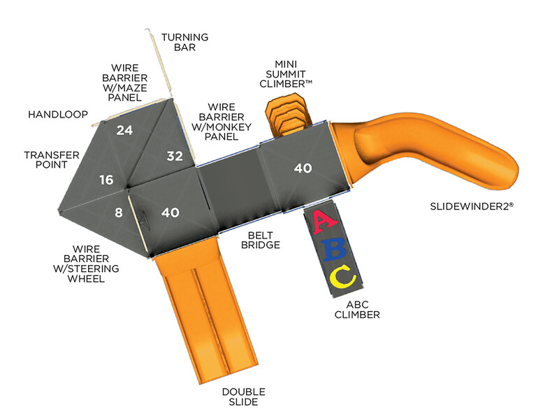 - Design 33 EZ includes the following components: ABC Climber, Belt Bridge, Double Slide, Handloop, Mini Summit Climber, Slidewinder2, Transfer Point, Turning Bar, Wire Barrier with Maze Panel, Wire Barrier with Monkey Panel and Wire Barrier with Wheel