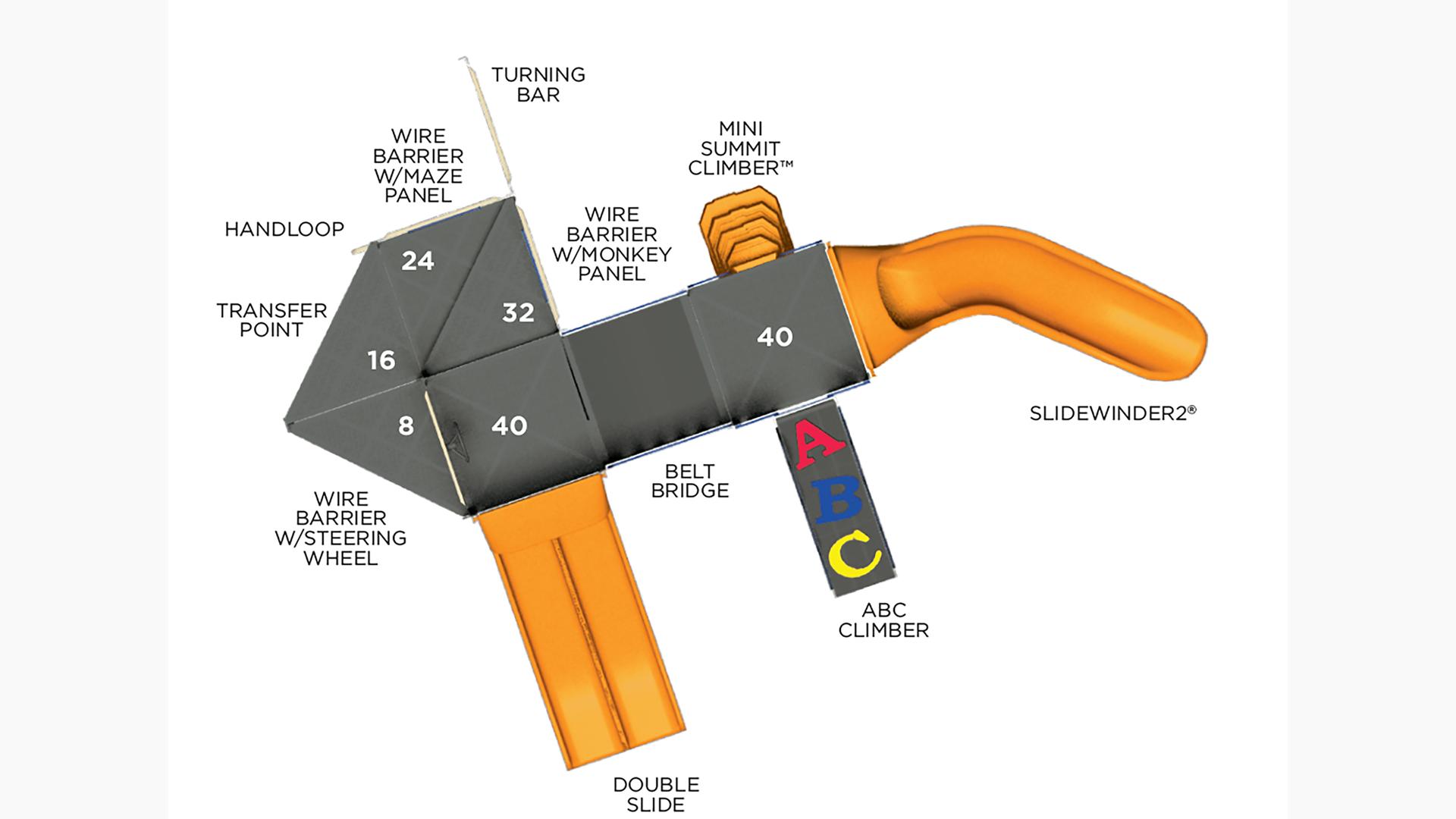 - Design 33 EZ includes the following components: ABC Climber, Belt Bridge, Double Slide, Handloop, Mini Summit Climber, Slidewinder2, Transfer Point, Turning Bar, Wire Barrier with Maze Panel, Wire Barrier with Monkey Panel and Wire Barrier with Wheel