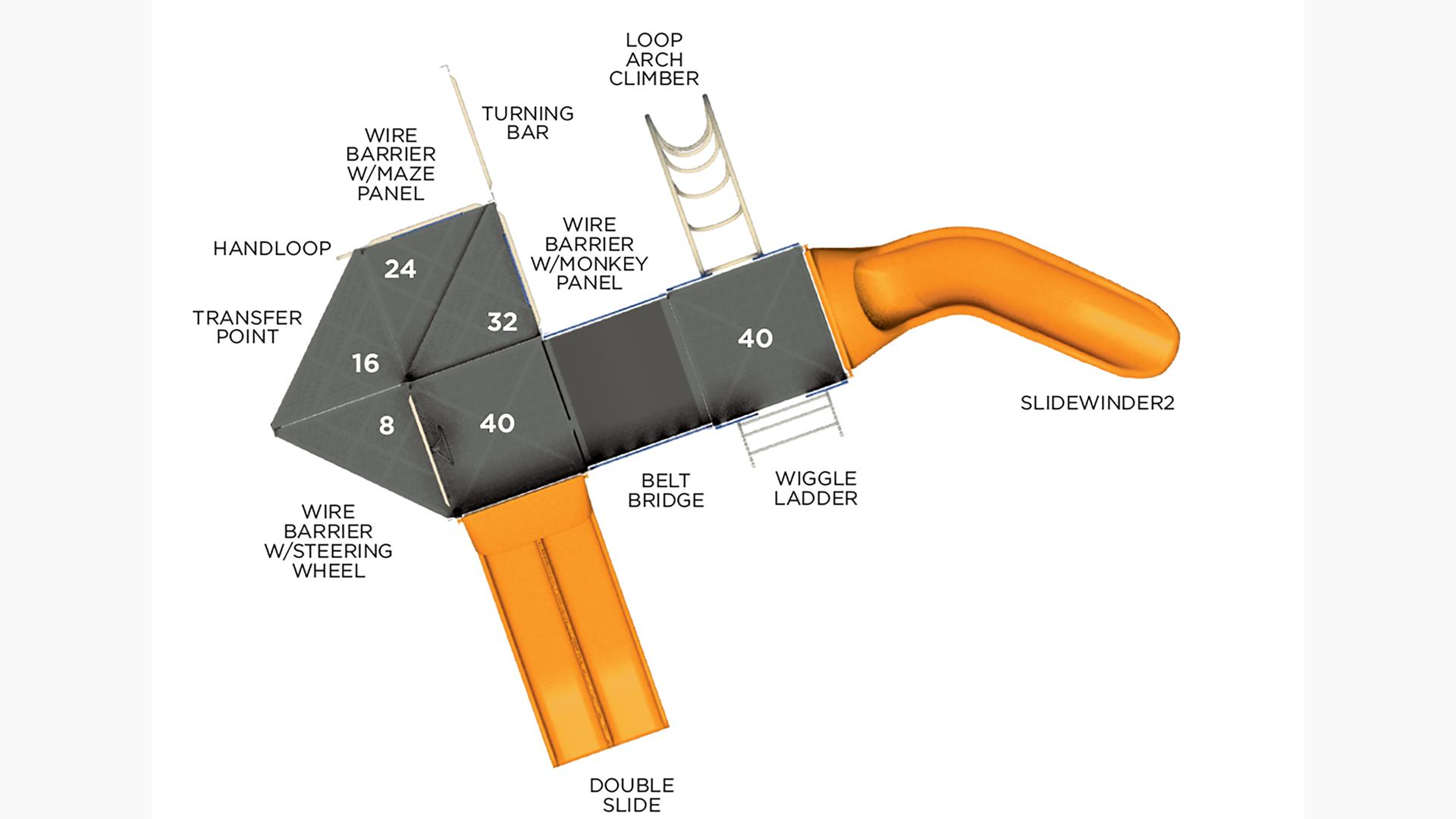 - Design 33 includes the following components: Belt Bridge, Double Slide, Handloop, Loop Arch Climber, SlideWinder2, Transfer Point, Turning Bar, Wiggle Ladder, Wire Barrier with Maze Panel, Wire Barrier with Monkey Panel and Wire Barrier with Wheel