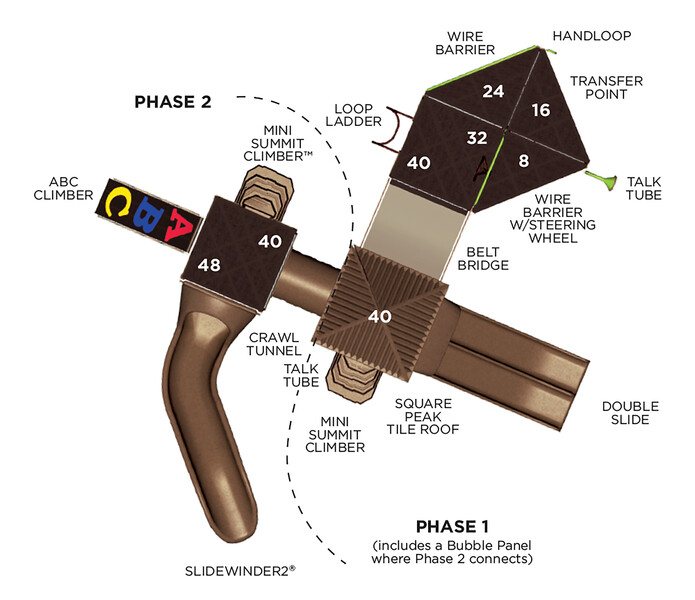 Phase 1 of Design 34 EZ contains several play events including a slide, climbers, and talk tubes to create a fun playground for any customers with a limited budget. This design has a Phase 2 option available.Features
