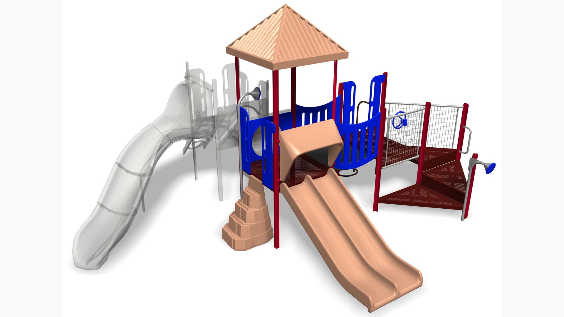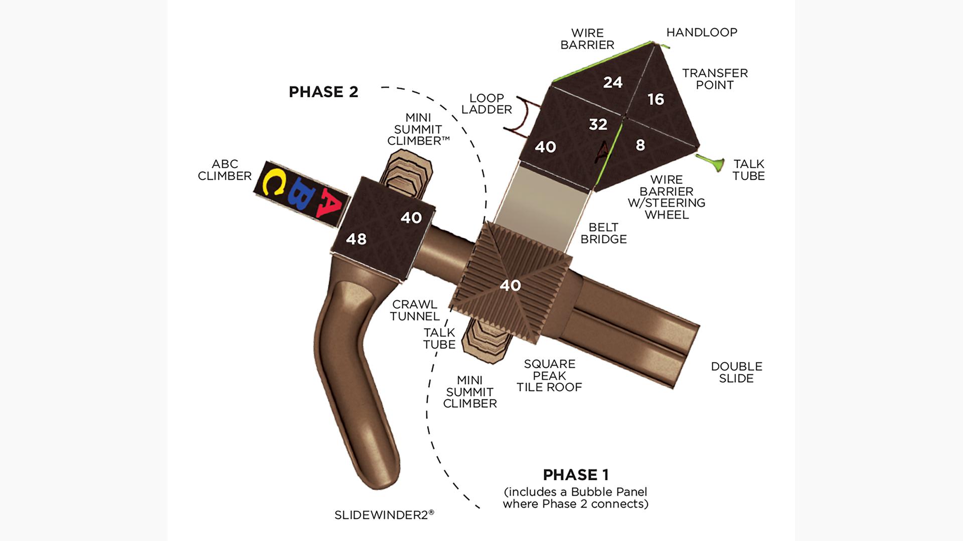 Phase 1 of Design 34 EZ contains several play events including a slide, climbers, and talk tubes to create a fun playground for any customers with a limited budget. This design has a Phase 2 option available.Features