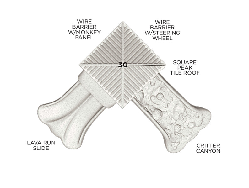 - Design 42 includes the following components: Critter Canyon, Lava Run Slide, Square Peak Tile Roof, Wire Barrier with Monkey Panel and Wire Barrier with Steering Wheel