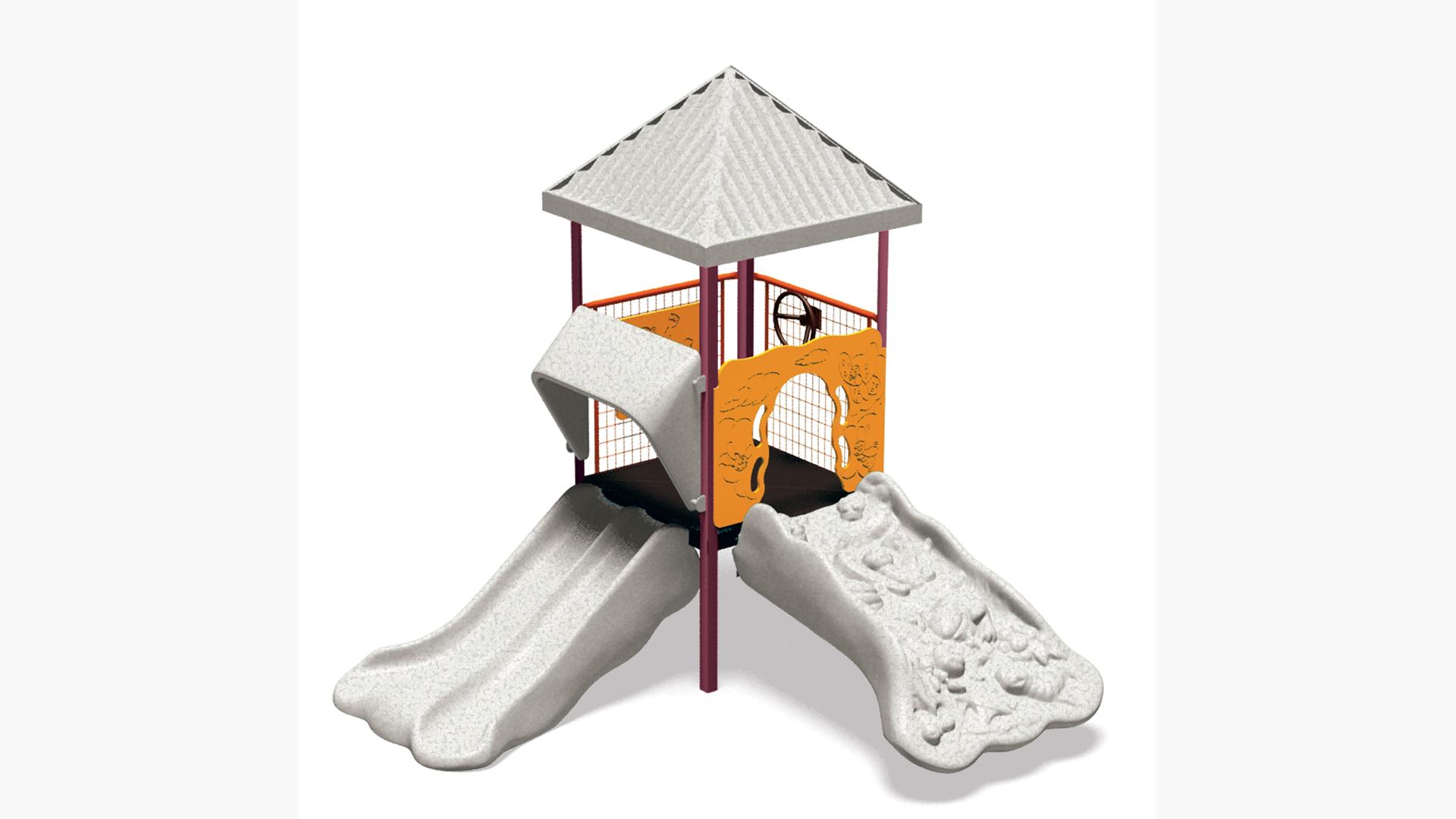 - Design 42 includes the following components: Critter Canyon, Lava Run Slide, Square Peak Tile Roof, Wire Barrier with Monkey Panel and Wire Barrier with Steering Wheel