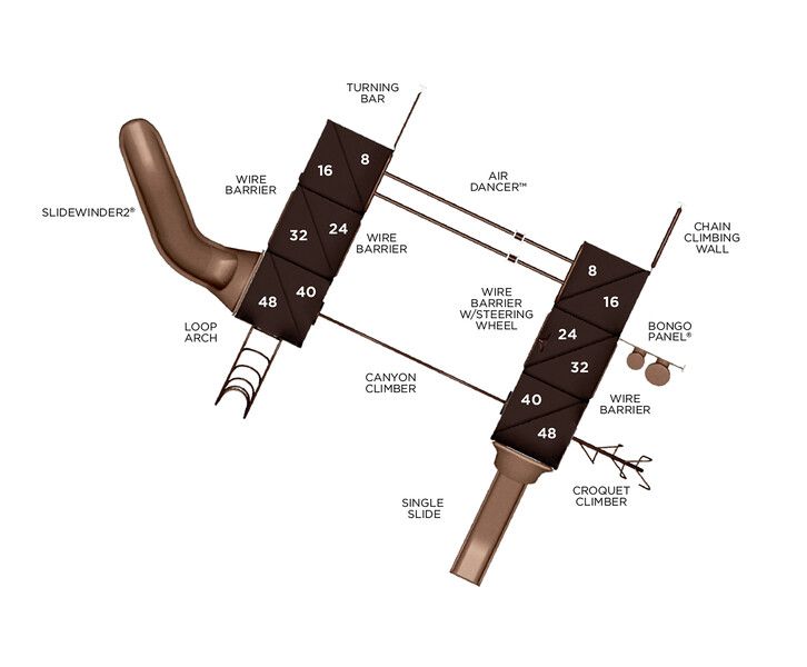 - Design 601 includes the following components: Air Dancer™ Overhead Event, Bongo Panel®, Canyon Climber, Climbing Wall, Croquet Climber, Handloop, Loop Arch Climber, Single Slide, SlideWinder2, Turning Bar, Wire Barrier (3) and Wire Barrier with Steering Wheel