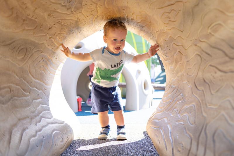 [video: scene fades into a full view of the natured-inspired log crawl tunnel. Scene switches to a close-up of a knot in the tree bark with a carving of a sleeping mouse. Scene switches to the camera zooming out from the mouse carving in the knot of the log crawl tunnel. Scene switches to a view of a young girl crouching and entering the log crawl tunnel. The girl enters as a young girl crawls and followers her into the tunnel. Camera pulls back for a full view of the crawl tunnel where a young girl sits inside the tunnel. Scene switches to a view through the tunnel as a boy walks towards the camera. Two children peak through the shaded tunnel to the other end. A young girl walks towards the camera through the tunnel and giggles. Scene switches to a boy as he touches the carved mouse in the outside knot of the log tunnel. Camera switches to a top down view as two children inspect the mouse caving on the side of the tunnel. The young girl walks away from the tunnel, she laughs.]