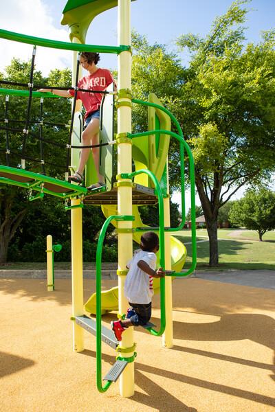 - Uniquely designed laser-cut perforated steel and polyethylene handholds help kids transition from climber to deck